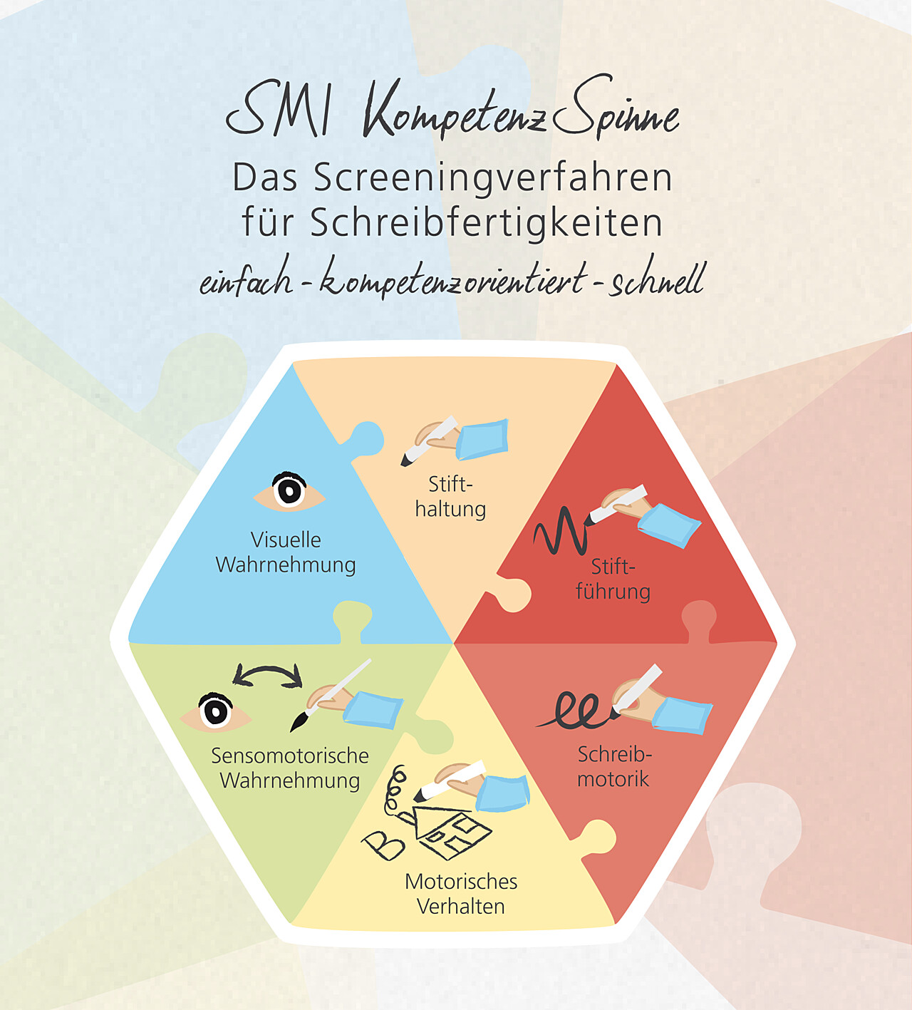 Die SMI KompetenzSpinne (Marquardt & Söhl, 2015; 2018) ist ein neues, wissenschaftlich evaluiertes Screeningverfahren zur Überprüfung der Schreibfertigkeiten von Kindern im Alter von vier bis sieben Jahren. Sie berücksichtigt sechs Kompetenzbereiche: Körper-, Sitz- und Stifthaltung, Basismotorik und Stiftführung, Schreibmotorik, sensomotorische Wahrnehmung, visuelle Wahrnehmung sowie motorisches Verhalten.